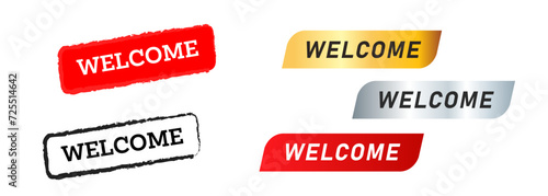 Welcome paper word sign with colorful spectrum paint brush strokes over white.