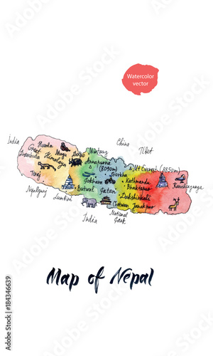 Map of attractions of Nepal, watercolor hand drawn vector illustration