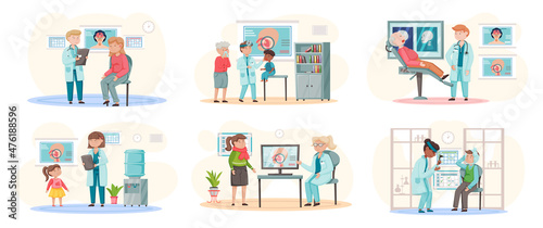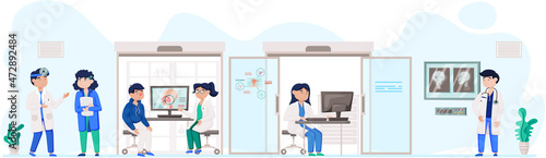 Doctors conduct examination, make diagnoses and treat sick patients, otolaryngologist take care of people health in medical clinic. Physician specializes in diagnosis and treatment of pathologies