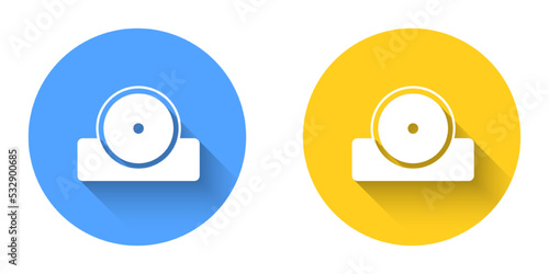White Otolaryngological head reflector icon isolated with long shadow background. Equipment for inspection the patients ear, throat and nose. Circle button. Vector