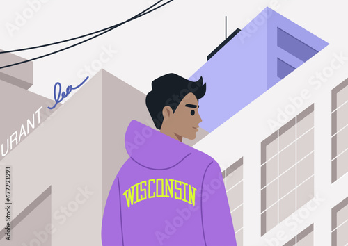 A youthful character strolling alone through the bustling downtown of a city, enveloped by skyscrapers and illuminated by neon signs