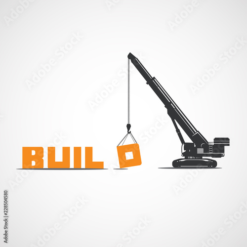 Mobile crane vector illustration, telescopic boom, construction equipment, heavy machinery, black and white silhouette, truss platform, industrial lifting gear, flavector