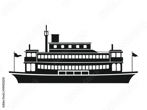 Black silhouette of antique riverboat with two smokestacks and flag white