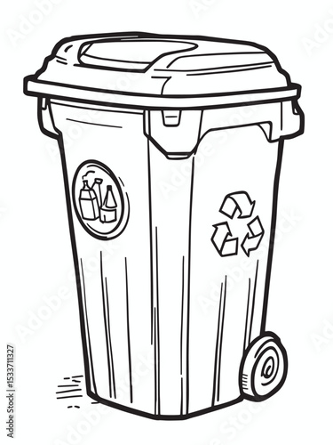 Kids recycling sorting activity with bins for paper, glass, plastic, and metal in line art