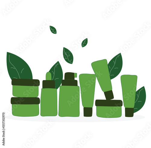 Natural organic cosmetics set. Collection of eco friendly herbal beauty products. Packaging, containers. Skincare, body care concept. Oil, cream, scrub for skin care. Isolated vector illustration