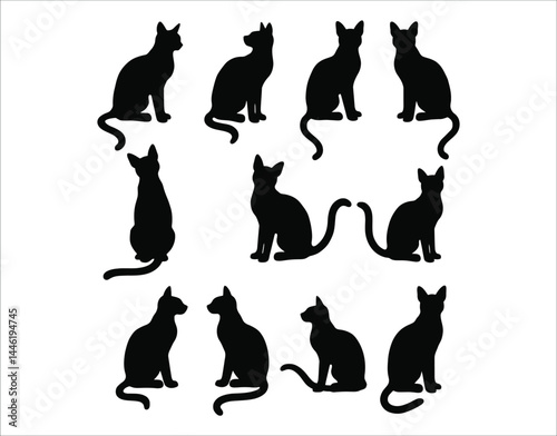 The sad cat smelled the remaining food in the bowl. Vector illustration isolated on white background.
