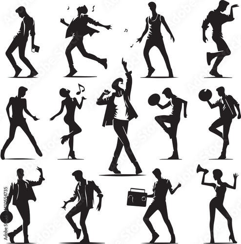 Performer silhouette illustration, singers, dancers, guitarist, dynamic stage poses, black vector icons, concert energy, isolated
