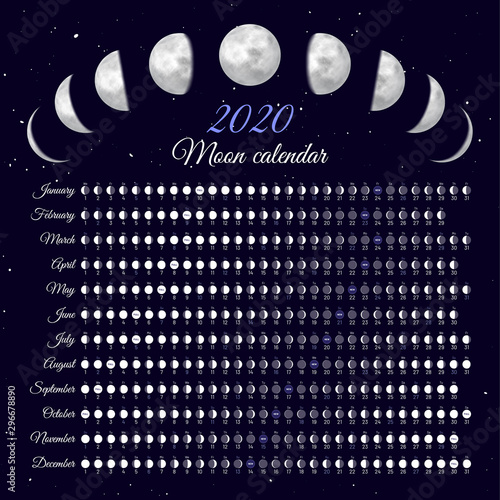 Lunar cycles at 2020 year. Moon phases calendar vector illustration. Dates for full, new moon and every phase in between. Daily moon illumination and moon age schedule on dark blue background