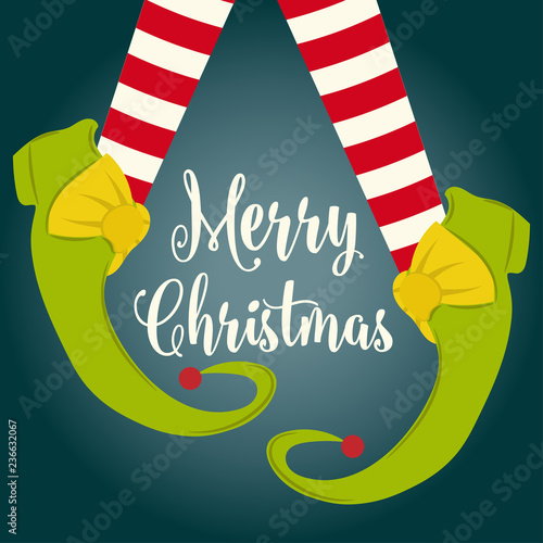 Merry Christmas background or banner with elf feet set, vector illustration. Collection of cute elves legs, boots. Santa helpers shoes and pants. Isolated on white background