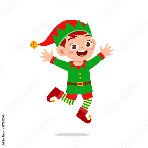 Cute boys and girls in Christmas elf costume jumping together. Flat vector cartoon design