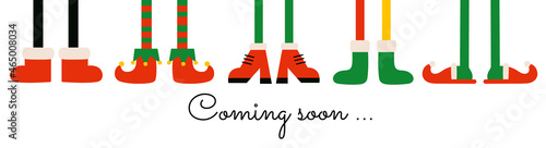 Coming soon Christmas banner poster horizonal template. Shoes and boots for elves feet. Elf gnome dwarf. Santa Claus helpers. Cute cartoon Christmas holiday elf feet and legs. Greeting card design