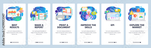 Mobile app onboarding screens. Financial presentation, business charts, KPI, market share, business education. Vector banner template for website and mobile development. Web site design illustration
