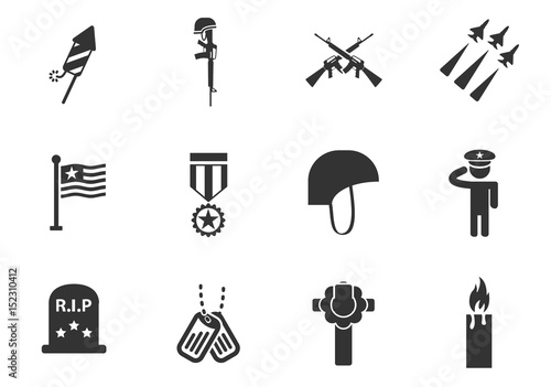 Memorial day and veterans day outline icon set with flag and military vector icons
