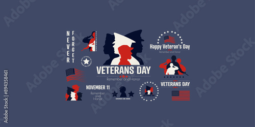 Happy Veterans Day. Greeting card with USA flag and soldiers on background with texture. National American holiday event. Flat vector illustration EPS10
