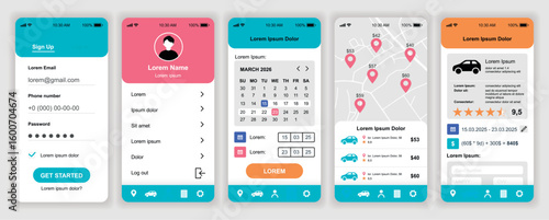 Car booking app concept in flat design. A collection of mobile app UI screenshots showing a car booking system with features like vehicle selection, user ratings and other. Vector Illustration.