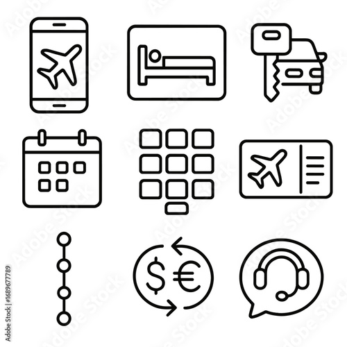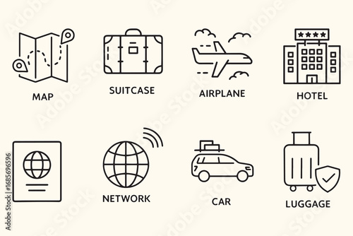 Travel Booking vector web line icon collection, sleek illustrations of tickets, maps, luggage, planes for seamless, adventurous designs.