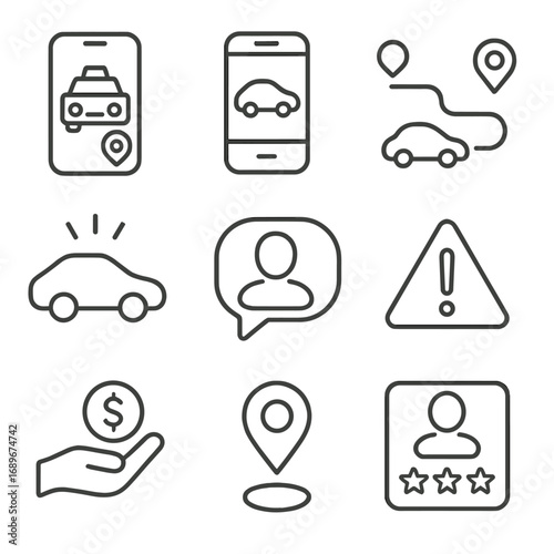 Collection of taxi cab line art icons showing front and side views. Urban transport service vector illustration