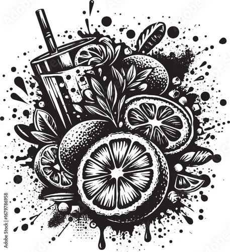Citrus fruit linocut illustration with lemon and orange slices black and white vector engraving for fresh food label and packaging design