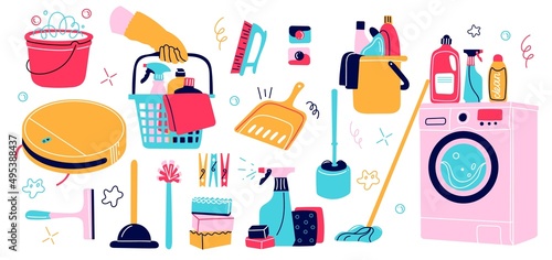 Set of Household cleaning supplies isolated icons in hand drawn flat style. Washing tools vector cartoon illustrations: bucket, chemistry . Graphic concept for web sites, banner, mobile apps