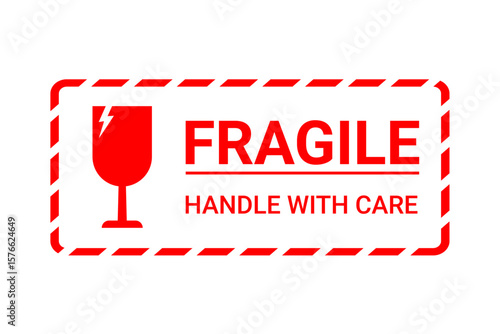 A prominent "Fragile - Handle with Care" label, crucial for careful shipping of goods. Modern flat vector sticker label with icon and badge style, transparent background