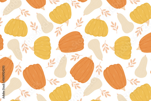 Pumpkins and Squash Harvest Pattern – swatch available in swatches panel – seamless hand drawn fall vegetables with delicate leaves