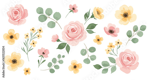 Elegant floral arrangement featuring pink roses, yellow blossoms, and eucalyptus leaves on a white background, creating a delicate botanical design