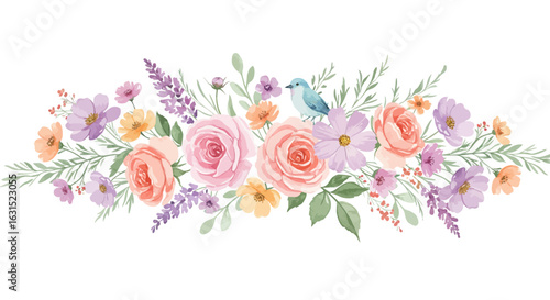 Watercolor floral arrangement with roses, lavender, and a blue bird creating a serene and delicate design