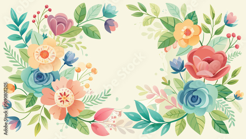 Vector art of watercolor floral frame with pastel flowers and green leaves, creating a delicate and charming border for invitations or greeting cards