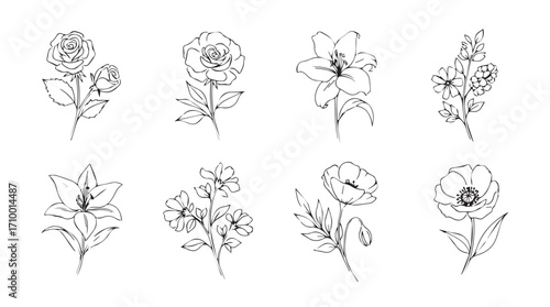 Delicate hand-drawn floral elements collection delicate botanical sketches elegant flower art for design projects silhouette