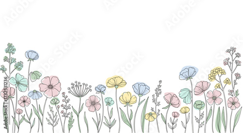 Beautiful hand-drawn pastel wildflowers in a delicate line art sketch style, decorative floral border element, vector illustration svg isolated on background.