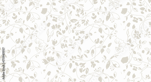 Elegant repeating floral pattern in soft cream and green tones, featuring delicate flower and leaf motifs. Ideal for wrapping paper, stationery, or fabric design.