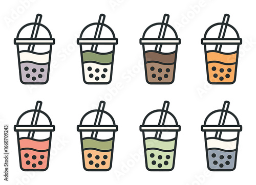 Bubble tea set. Boba drinks in cups with straw with different flavours. Ice coffee with milk, juice, milkshake. Beverages with matcha, taro, tapioca. Flat isolated vector illustrations on white