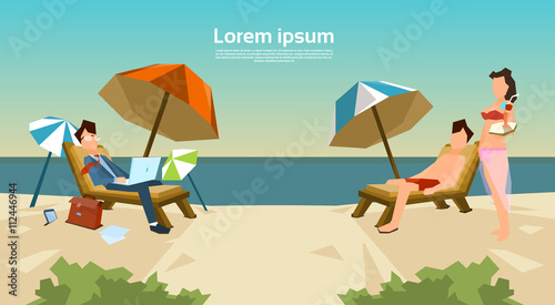 Freelance work web concept. Woman freelancer working on laptop relaxing on beach. Remote worker. Template of people scene. Vector illustration with character activities in flat design for website