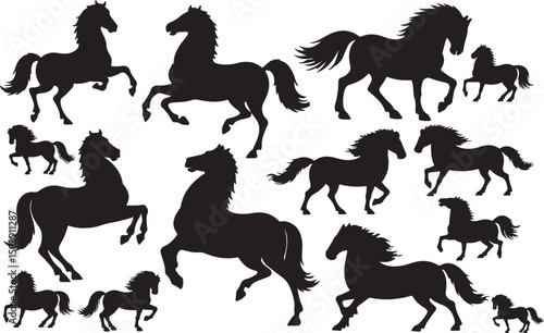 Pegasus silhouettes in flight and standing poses, mythical winged horse collection, fantasy vector artwork for legend, magic, tattoo, stock design