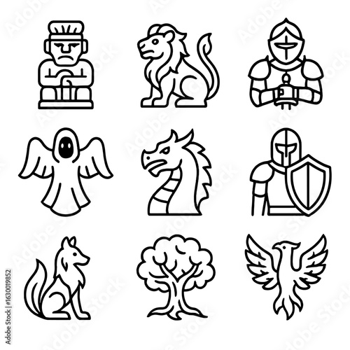 Fantasy illustration set, wizard, dwarf, sorceress, fairy, dragon, elf archer, mythical characters, folklore heroes, black and white design