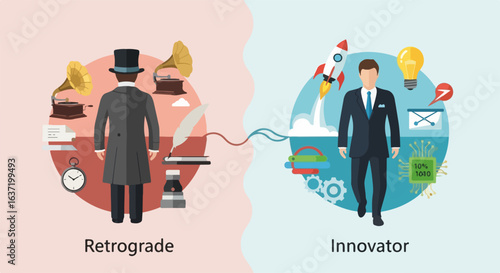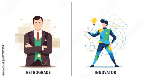 Contrasting retrograde innovator concepts with businessman and innovative person. Retrograde innovator theme shows two opposing ideas.