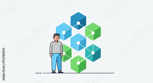 Abstract geometric network of hexagonal blocks with a person standing nearby, representing data connections and technological innovation