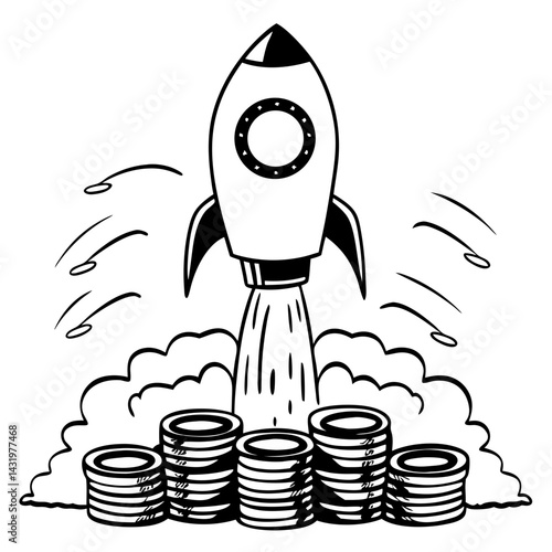 A black and white illustration of a rocket ship in various stages of launch, with a white background.