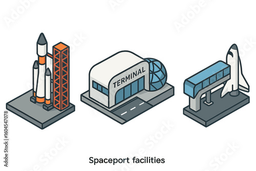 Spaceport facilities icon set. Isometric vector of a rocket launch tower, passenger terminal, shuttle boarding ramp. Space tourism, exploration, future travel concept.