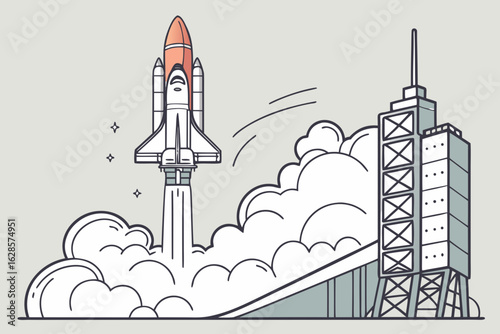 Space shuttle ascent from launchpad with dense smoke and flames. Vector hand drawn illustration