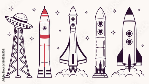 Silhouettes of various rockets and a jet, in different stages of flight, against a white background.