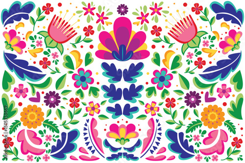 Mexican flower traditional pattern background. Ethnic embroidery decoration ornament. Flower symmetry texture. Ornate folk graphic, wallpaper. Festive mexican floral motif. Vector illustration