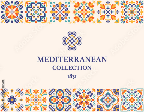 Label, card or banner template with azulejo mosaic tile pattern, blue, turquoise, yellow colors, floral motifs. Mediterranean, Portuguese traditional vintage style. Vector illustration