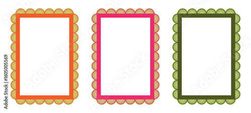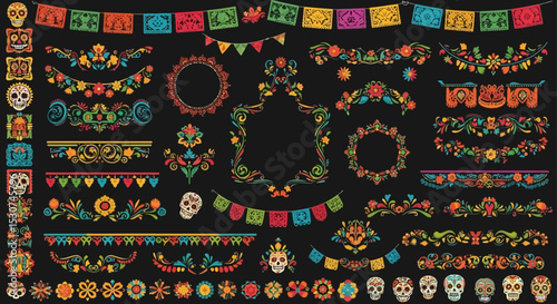 Vibrant Mexican decorative frame borders on dark background. Traditional papel picado style with colorful floral patterns, skulls. Festive ornamental rectangles for celebration design elements.
