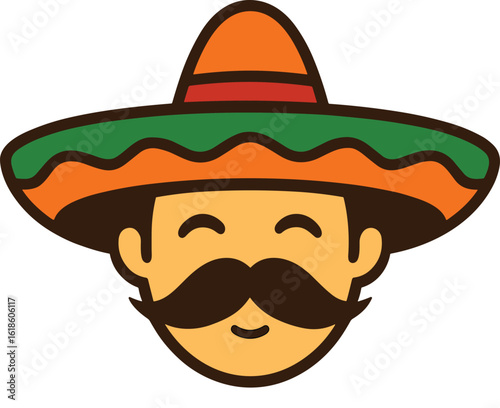 Cheerful cartoon illustration of a mexican man wearing a sombrero and a large brown mustache