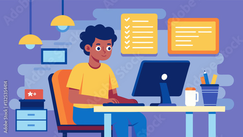 In a quiet study hall a student works independently on coding a program that will automate a tedious process in their schoolwork.. Vector illustration