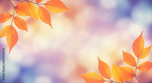Autumn leaves frame a soft bokeh background with warm orange, yellow, and purple hues creating a peaceful backdrop for design