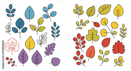 Colorful botanical illustration featuring diverse leaf shapes and vibrant hues