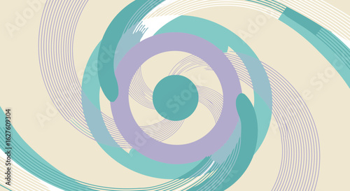 Abstract design with pastel teal and lavender hues in a swirling pattern. Circular shapes and overlapping lines create a dynamic, visually appealing backdrop.