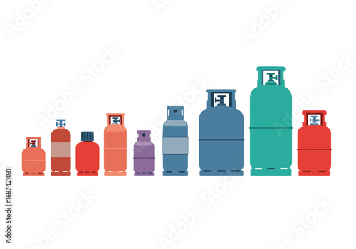 Gas cylinders. Lpg propane container, oxygen gas cylinder and canister. Fuel storage liquefied compressed gas high pressure vector set